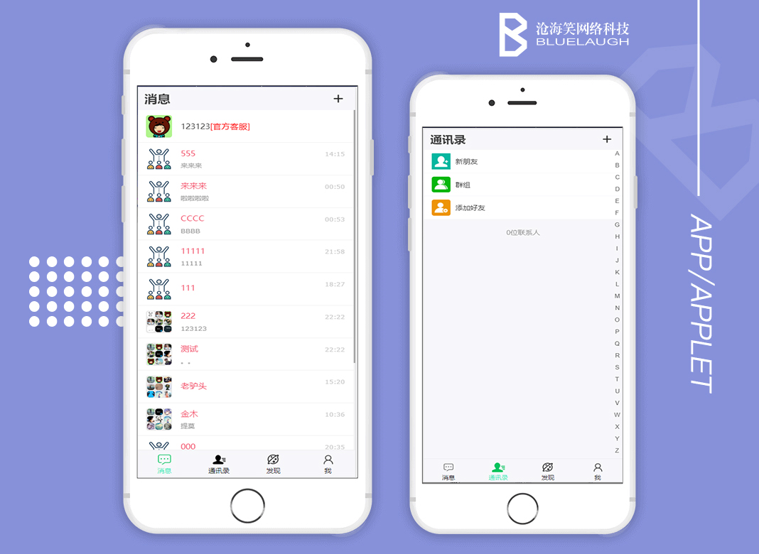 群功能:设置群二维码,群公告,昵称,头像,群共享文件,顶置聊天,消息免打扰,屏蔽群信息,指定某人单独禁言,全体禁言,举报,群管理,查找聊天记录,消息过期销毁,清空聊天记录等等功能。